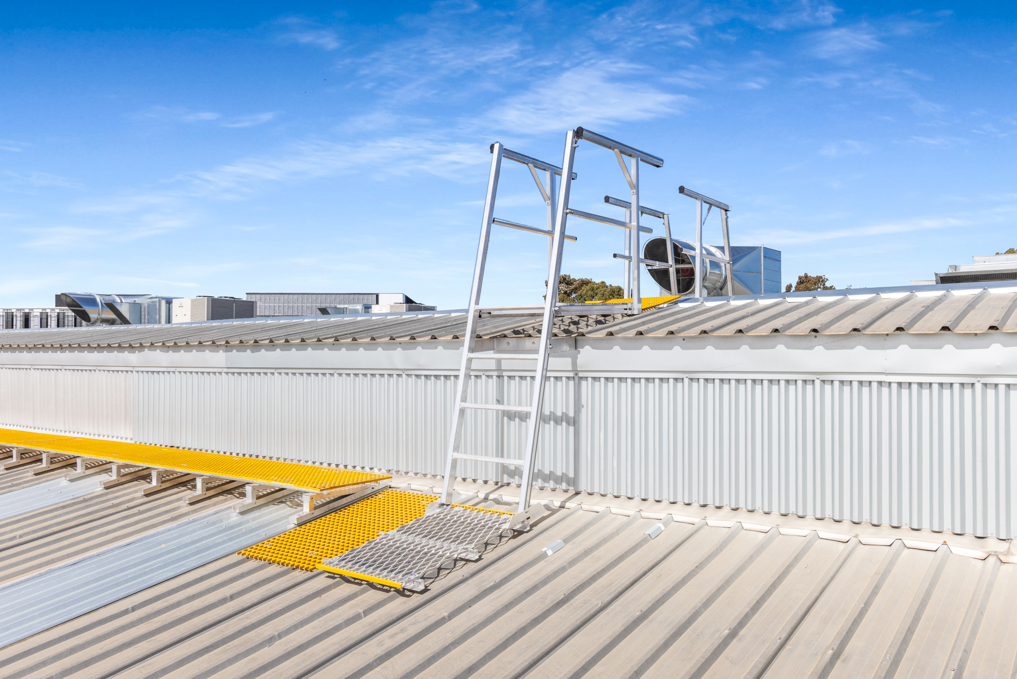 Hart designed and constructed a complete roof safety system to support ongoing maintenance of the solar arrays and cooling units. Plant platforms were installed with acoustic screens to help manage noise of the HVAC equipment. While the ground-level batten screen increases the building’s architectural appeal. Our complete user-friendly solution included: