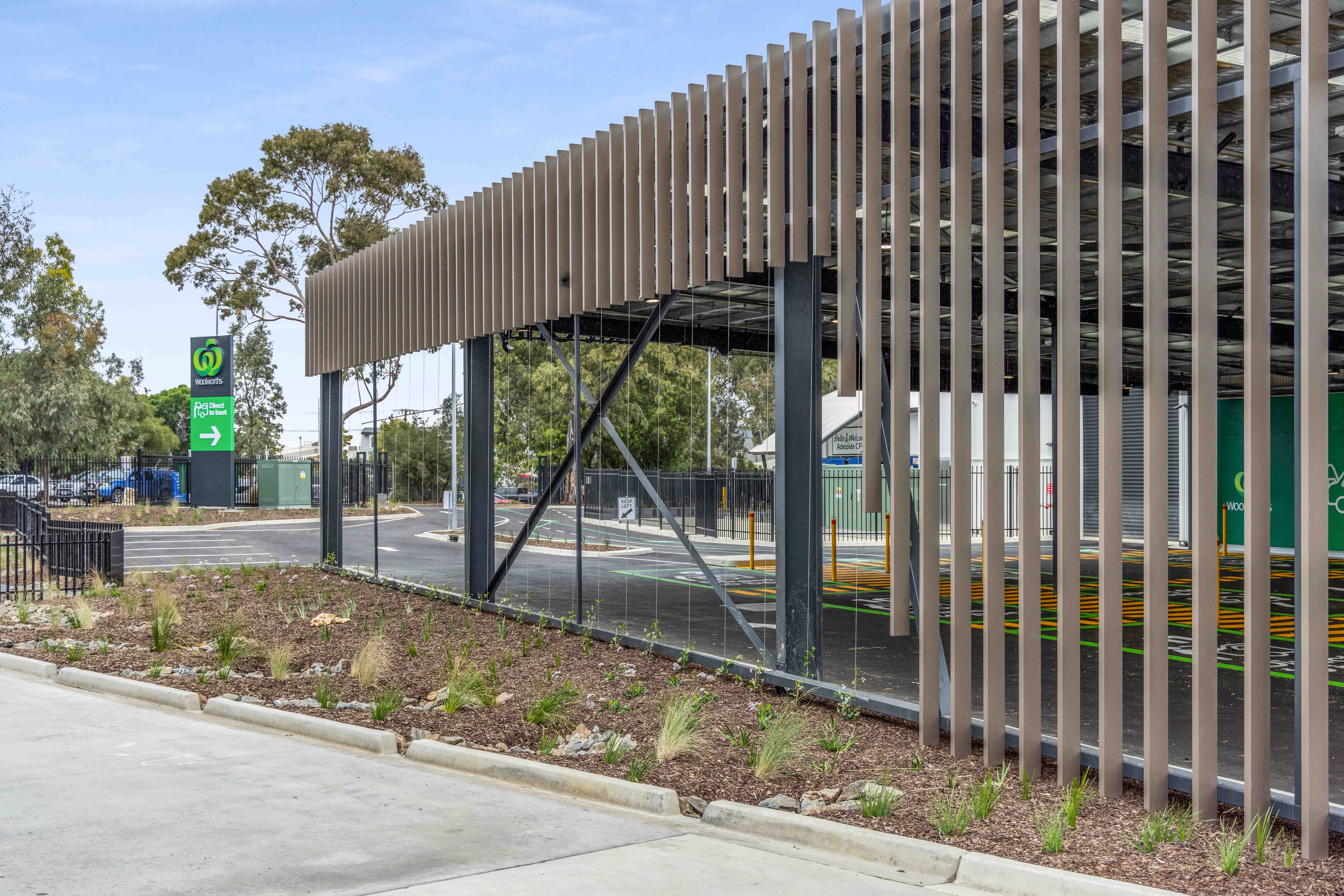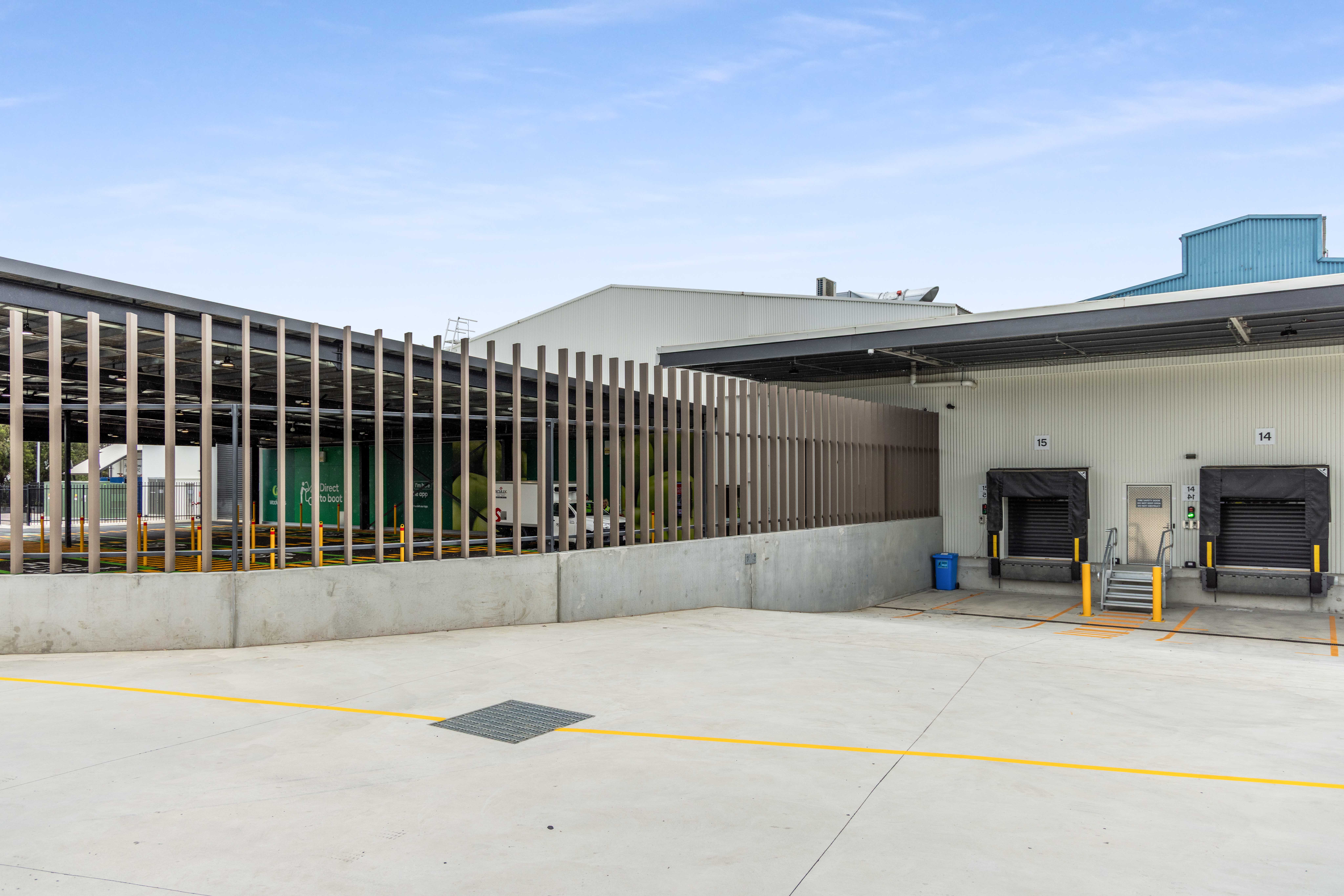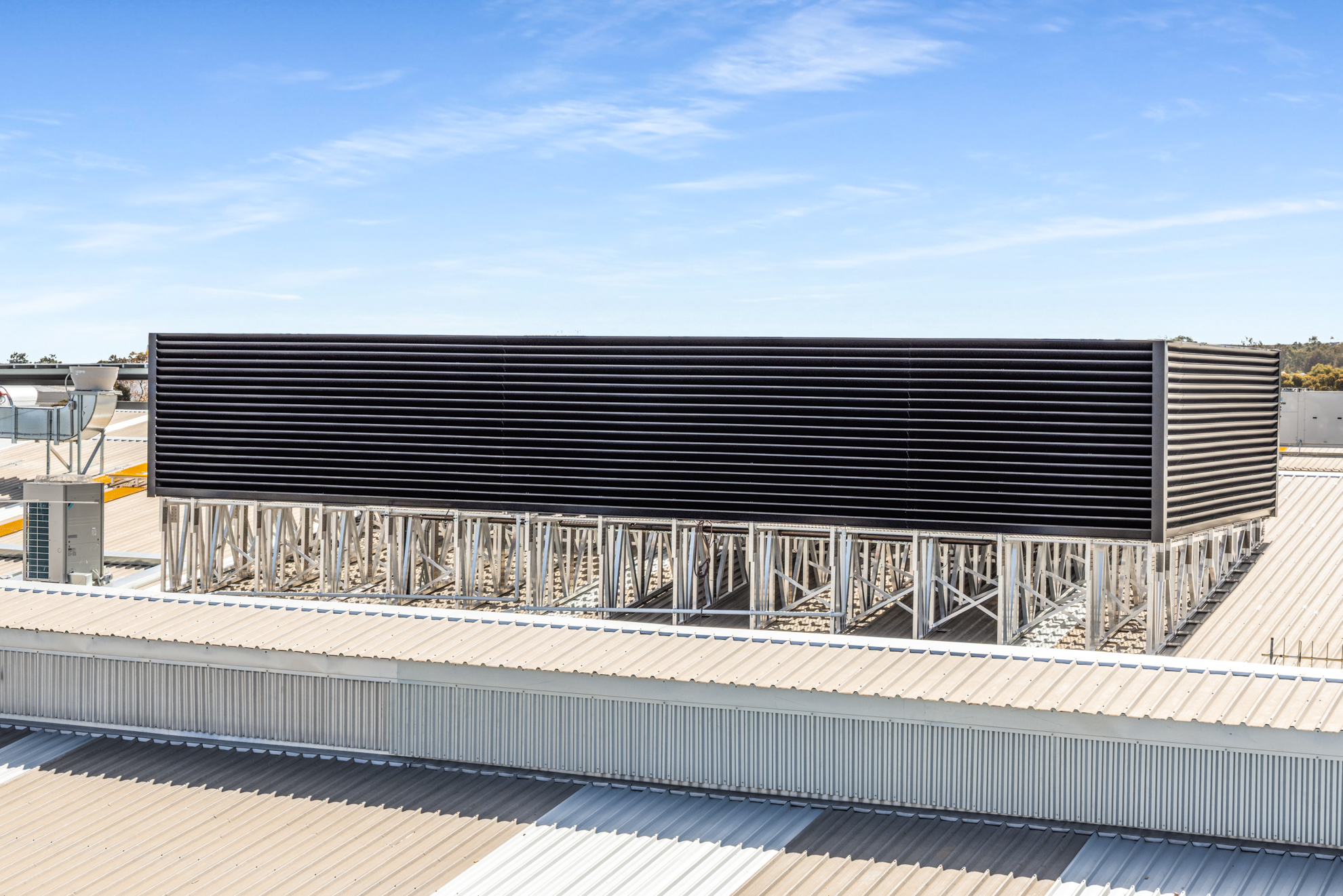 With multiple solar arrays and cooling units due for installation on the roof, Hart was engaged to design and construct a roof safety system and HVAC platforms with acoustic screens. Our scope also included a ground-mounted batten screen wrapping around the direct-to-boot area.